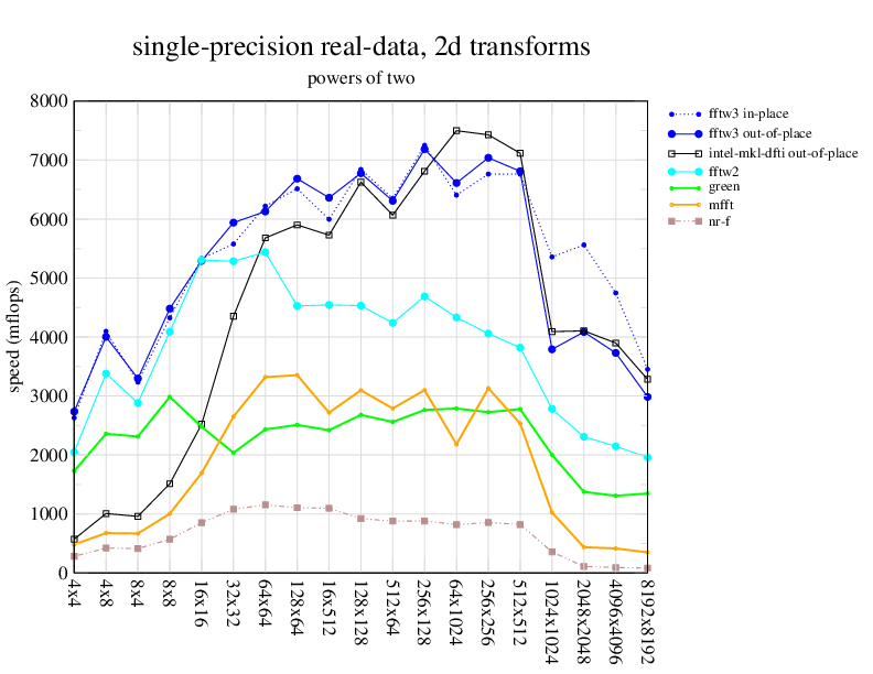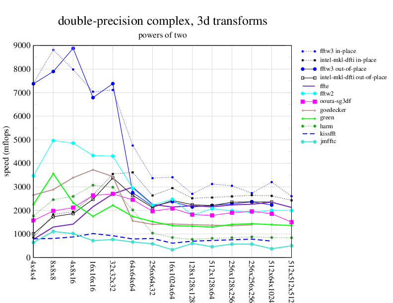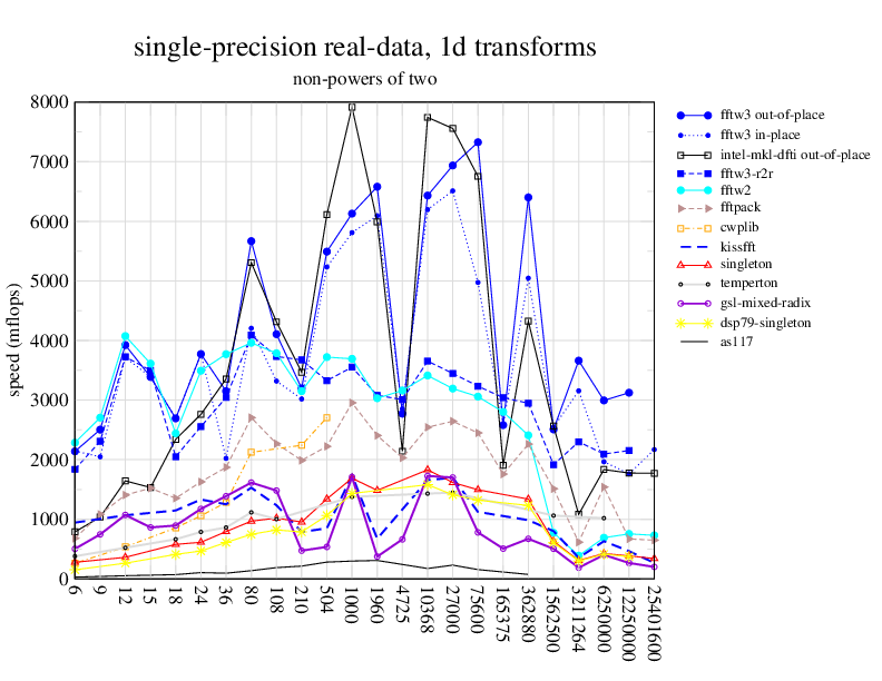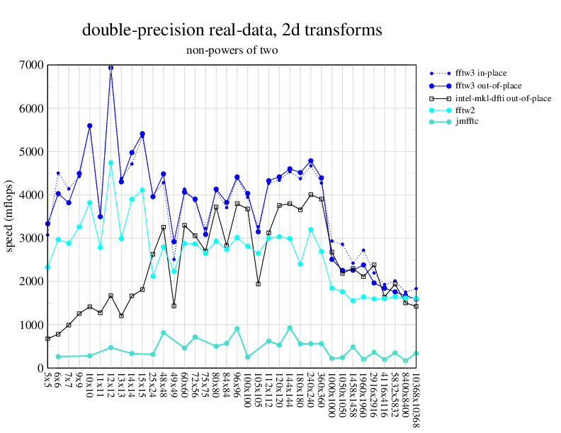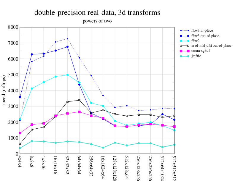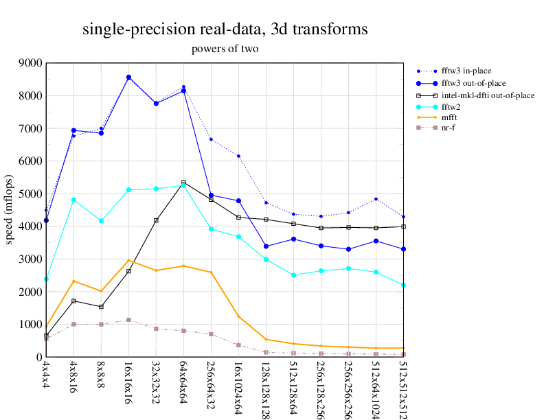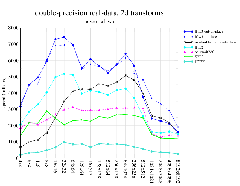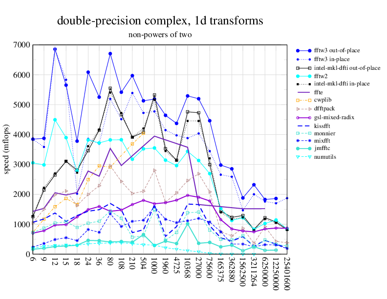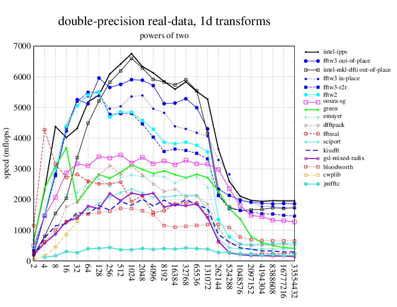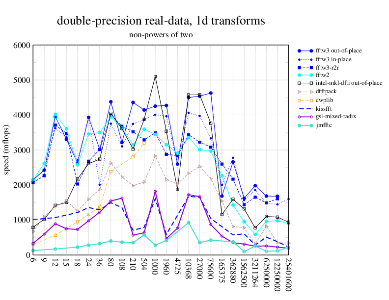 NOTE: Because this benchmark includes very large transforms, we noticed a bug in FFTW 3.1.2 that causes it to pick suboptimal algorithms for transforms that take more than a couple of seconds. We therefore benchmarked a version of FFTW patched to fix this bug; the patch will be included in the next release, but for now you can just edit kernel/timer.c to replace 1.0E10 with 1.0E100. Sorry about that.