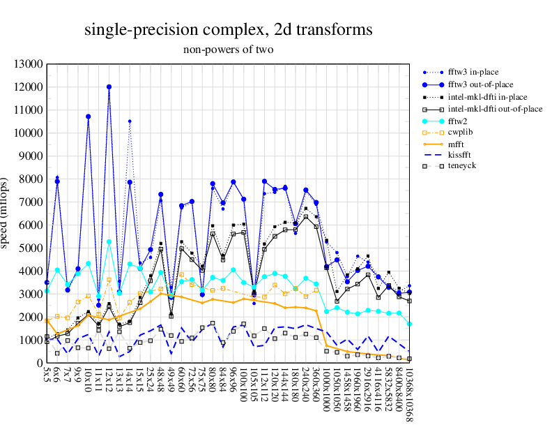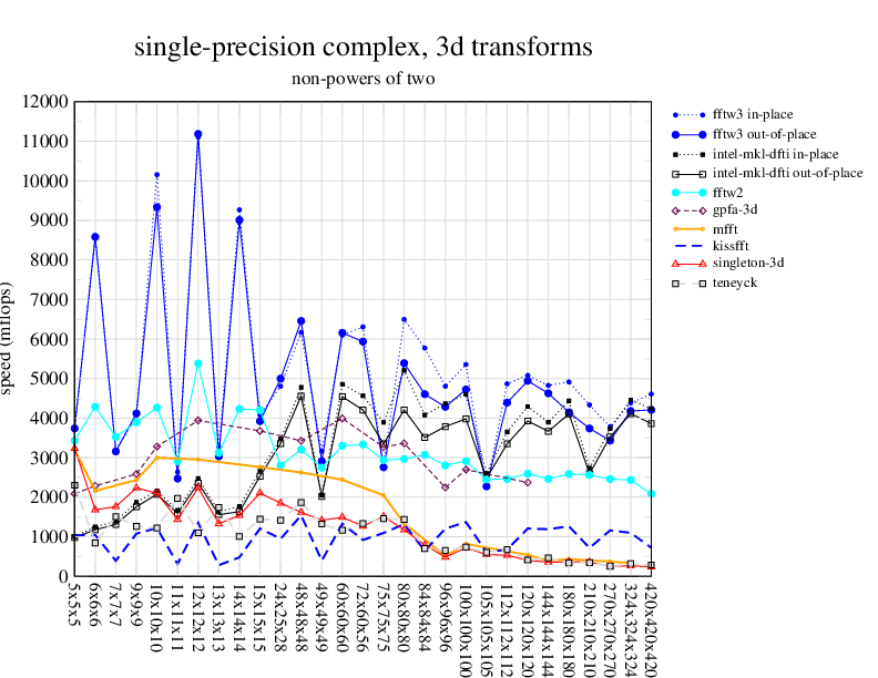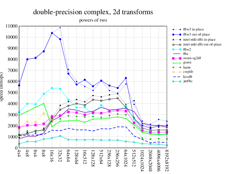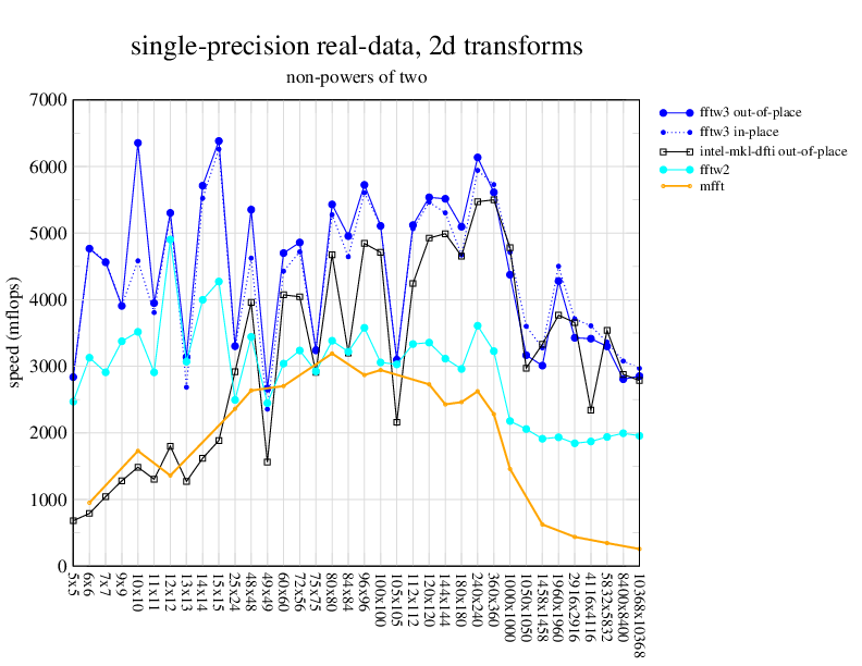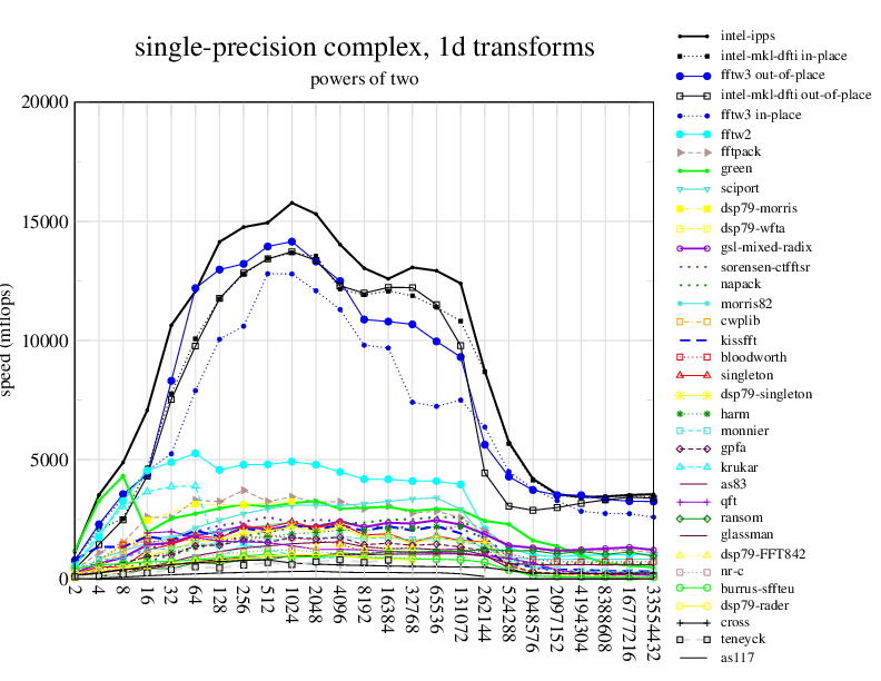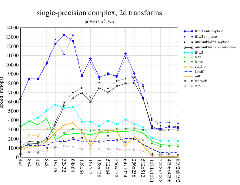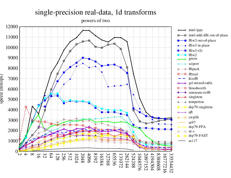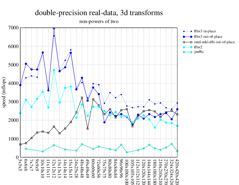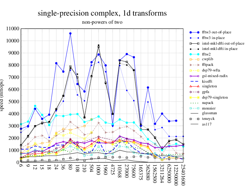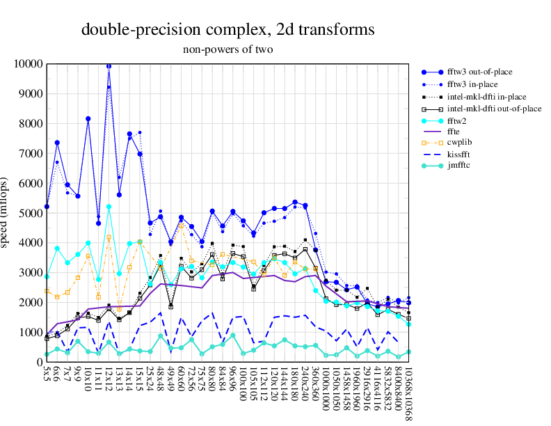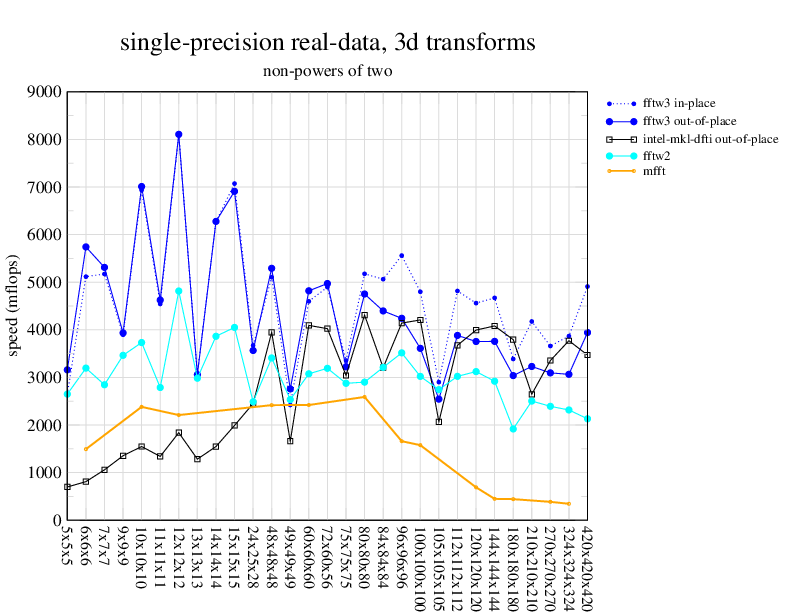 NOTE: Because this benchmark includes very large transforms, we noticed a bug in FFTW 3.1.2 that causes it to pick suboptimal algorithms for transforms that take more than a couple of seconds. We therefore benchmarked a version of FFTW patched to fix this bug; the patch will be included in the next release, but for now you can just edit kernel/timer.c to replace 1.0E10 with 1.0E100. Sorry about that.
