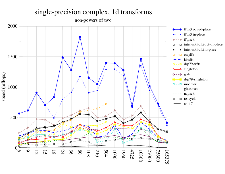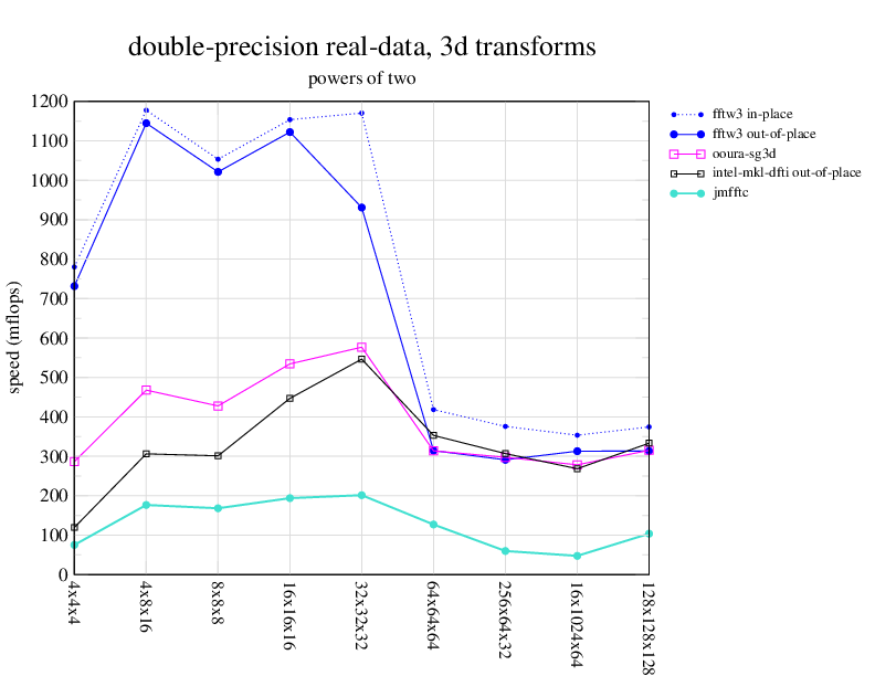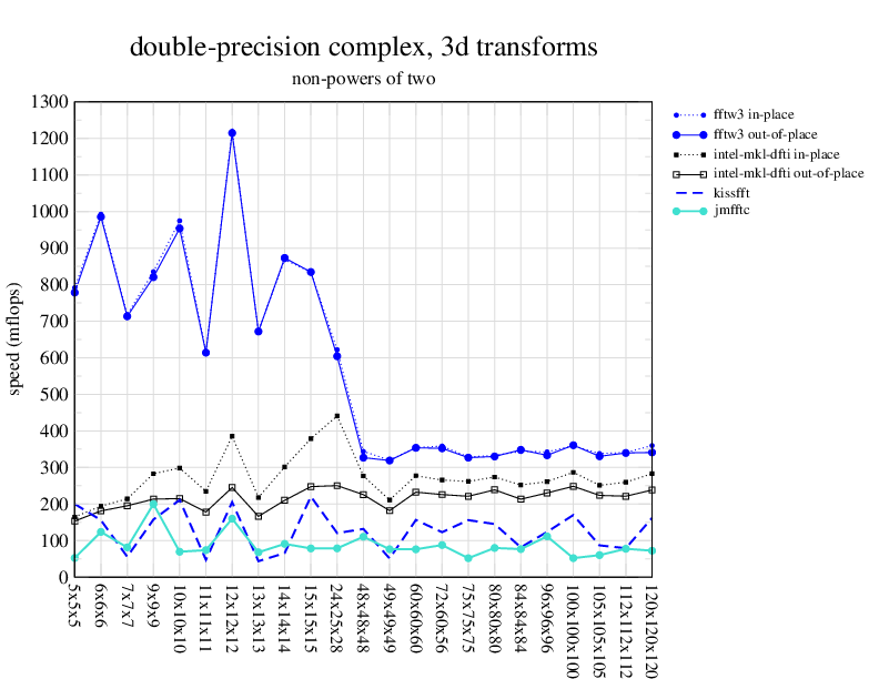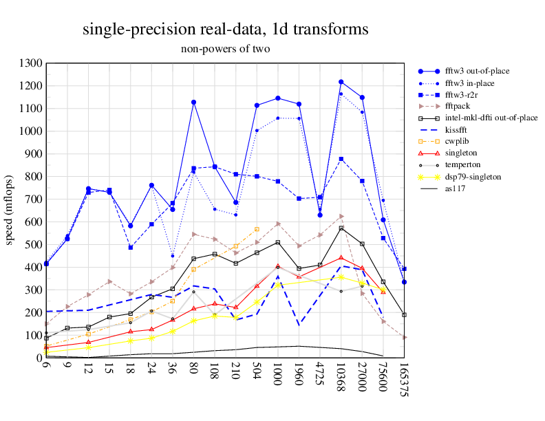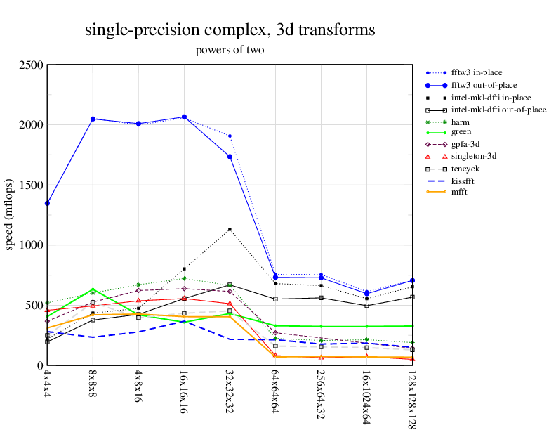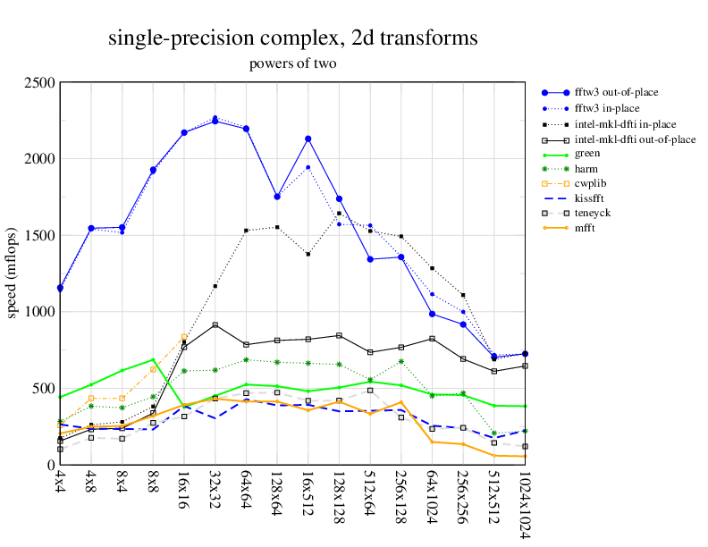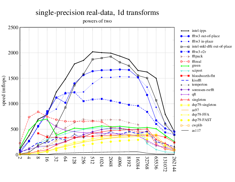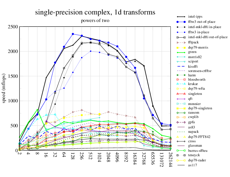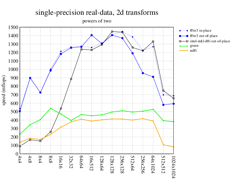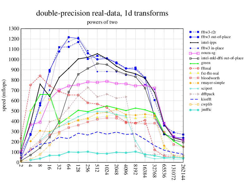 1.266 GHz Intel Pentium 3, 512 KB L2. Linux 2.4.21, gcc-3.2.3, g++-3.2.3, g77-3.2.3, Intel Math Kernel Library Version 8.0.1 Intel Integrated Performance Primitives v5.0. Has SSE (4-way single precision SIMD).