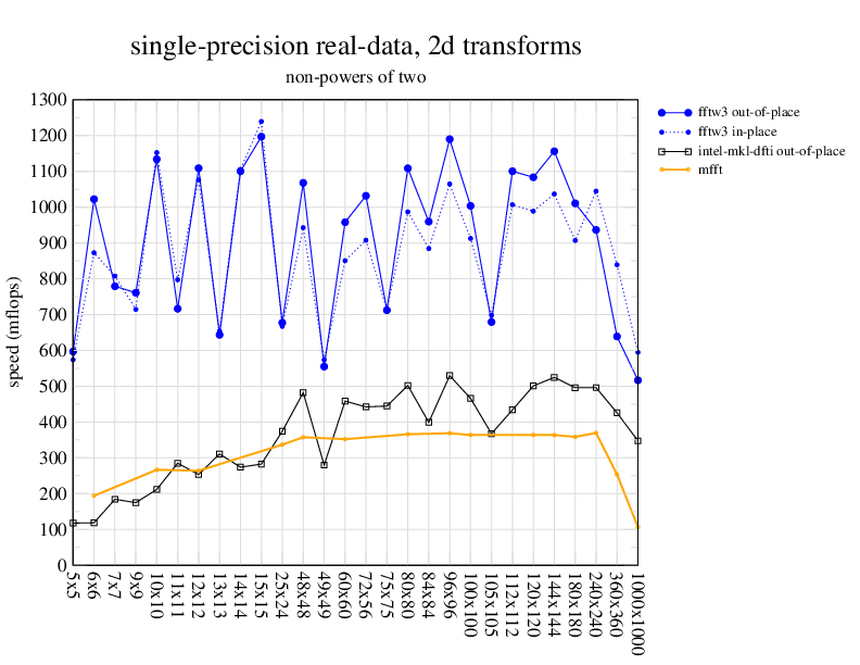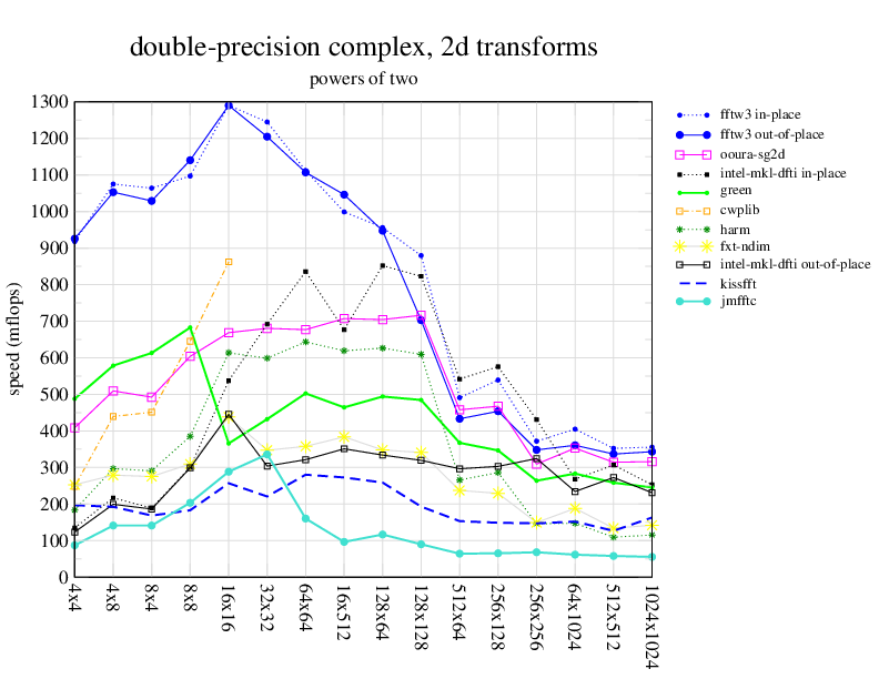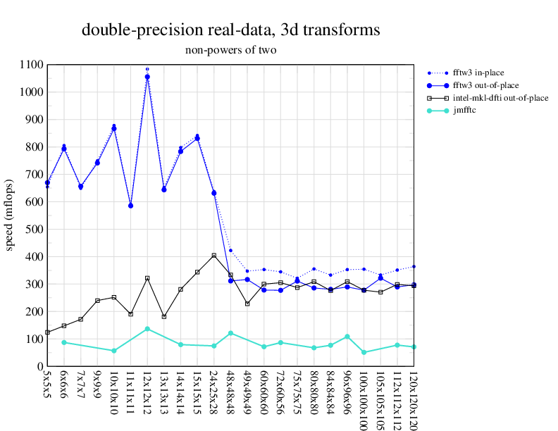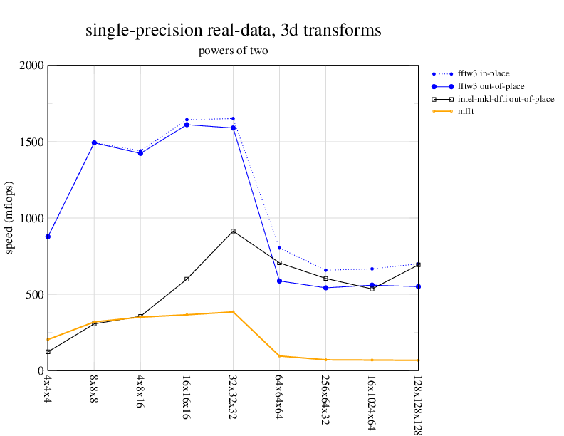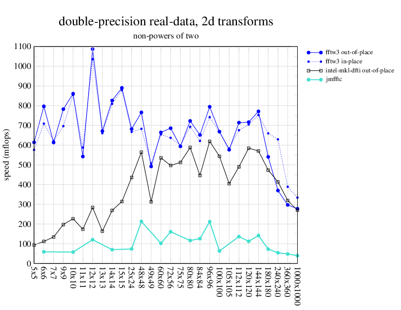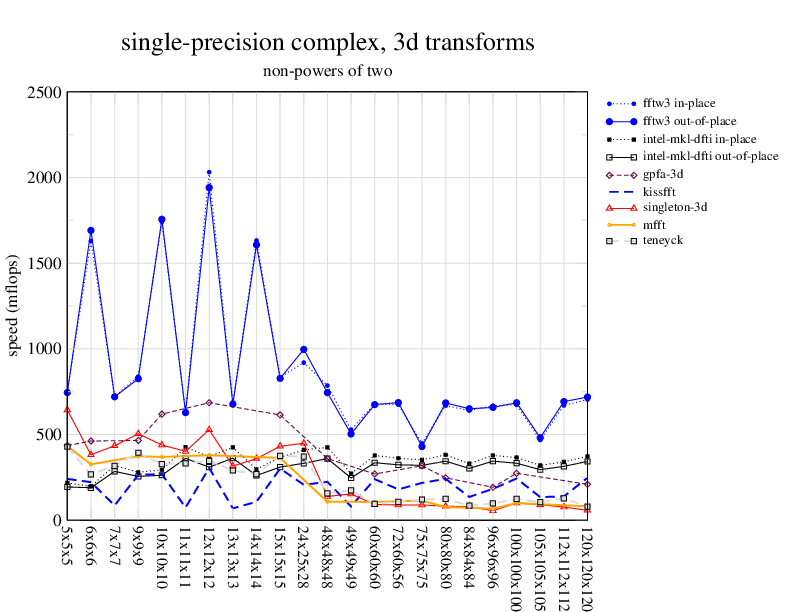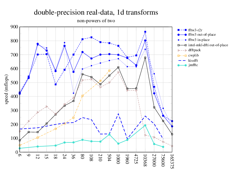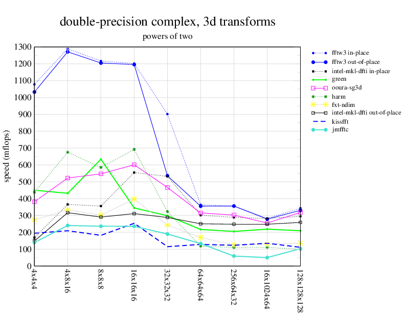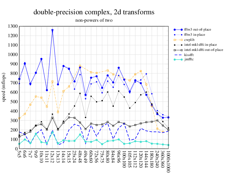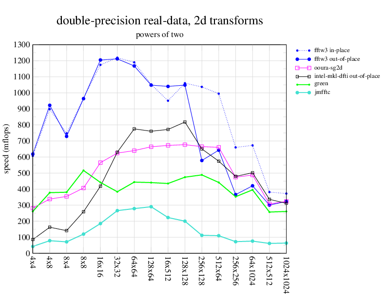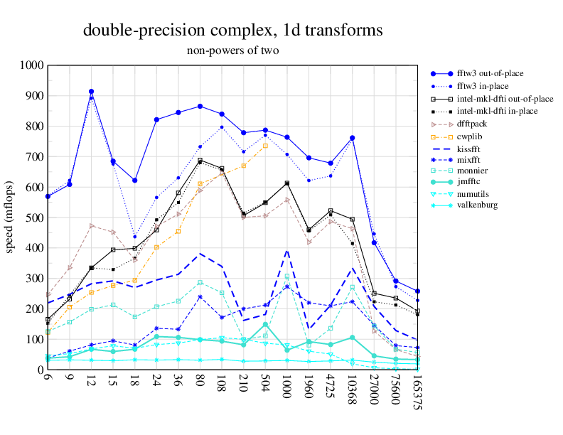 1.266 GHz Intel Pentium 3, 512 KB L2. Linux 2.4.21, gcc-3.2.3, g++-3.2.3, g77-3.2.3, Intel Math Kernel Library Version 8.0.1 Intel Integrated Performance Primitives v5.0. Has SSE (4-way single precision SIMD).